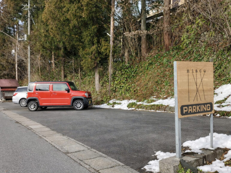 miscuの駐車場は村の入口に位置していて写真のサインが目印です。混雑の際は軽自動車などの小さな車は駐車場の幅がやや狭まっている下側に駐車してください。駐車場からmiscuまでは100メートルほど坂を下ります、右側にmiscuの看板が立っていますので横の砂利の階段を30段ほど登っていただくと到着です。お荷物の積み下ろしの際には宿の前に一時駐車してくださって構いませんが終了後はすみやかにお車を駐車場へ移動されることをお願いいたします。